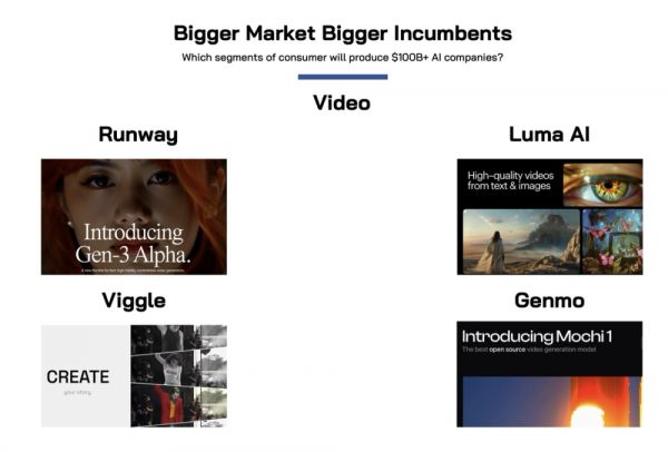 如今,视频⽣成领域投融资是GenAI领域最活跃赛道之⼀,大厂企业和初创公司共同瞄准这一细分方向。面对拥有更丰富资源、更完整生态的大厂,初创企业在创新功能、创新产品上的优势常常会被模仿以及超越,初创企业需要尽早找到自己的立足根本,逐渐成长为百亿级企业。
