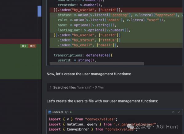 Cursor 新版本让用户大大简化了复杂代码的实现过程。比如在用户管理的例子中,Cursor 自动生成了一整套逻辑清晰的 TypeScript 代码,包括“表定义”“字段类型”和“索引”,甚至连用户状态(pending、approved 等)和角色字段(admin、user)都考虑到了。