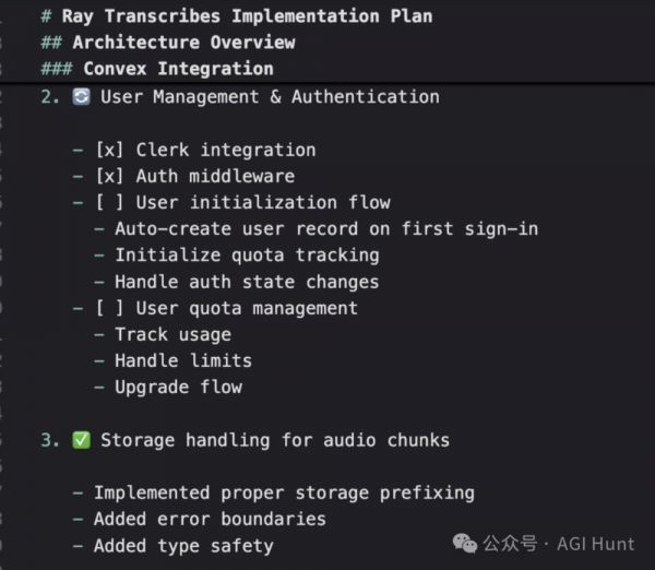 更令人震惊的是,Cursor 不仅能写代码,还能自动生成完整的项目实施计划。从用户管理到存储处理,从错误边界到类型安全,每个细节都安排得井井有条。