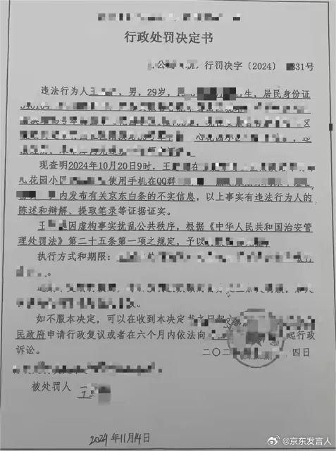 京东公开的警方处罚决定书显示,王某在社交软件上发布有关于京东白条的不实信息,因虚构事实、扰乱公共秩序已被警方处理。另外,其他谣言也已在立案调查中。