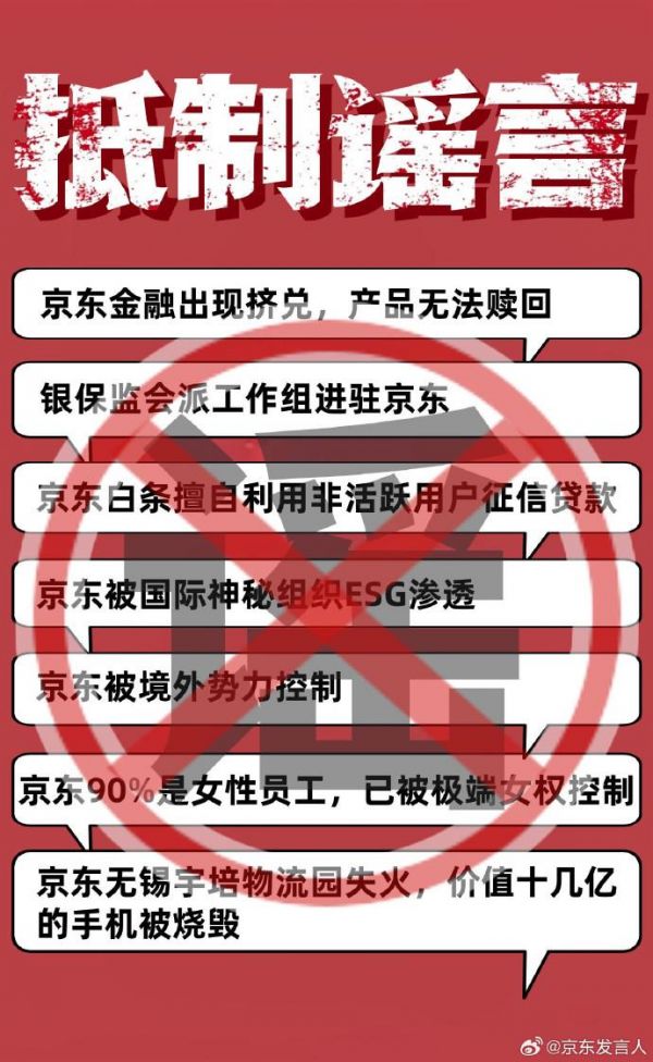 京东发言人称,公司近期以来在网络社交平台上遭受连续造谣攻击,一段时间以来,网络造谣者通过编造一些抓眼球的虚假内容,发布“京东金融遭挤兑”、“京东白条虚假征信”、“京东被国际神秘组织ESG渗透”、“京东女性员工占比超过90%,已被极端女权控制”、“京东无锡宇培物流园失火中价值十几亿的手机被烧毁”等话题,有组织、有蓄谋地对京东和京东创始人及家人进行舆论攻击。
