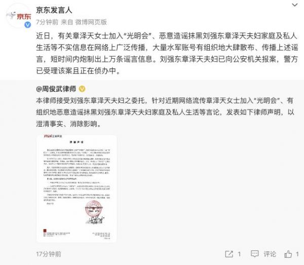 此前,10月16日,@京东发言人 发布声明称,近日,有关章泽天女士加入“光明会”、恶意造谣抹黑刘强东章泽天夫妇家庭及私人生活等不实信息在网络上广泛传播,大量水军账号有组织地大肆散布、传播上述谣言,短时间内炮制出上万条谣言信息。刘强东章泽天夫妇已向公安机关报案,警方已受理该案且正在侦办中。