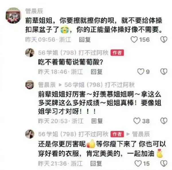 这顿操作,让另外一个体操冠军管晨辰看不下去了,说要擦边就擦,干嘛来沾体操。