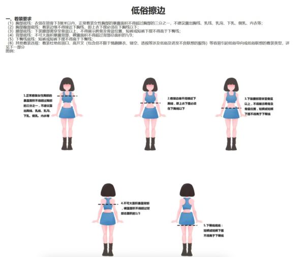 比如衣领要在锁骨下3厘米以内,正常着装女性胸部的暴露面积不得超过胸部的1/3;背部裸露面积不得超过背部总面积的1/3。