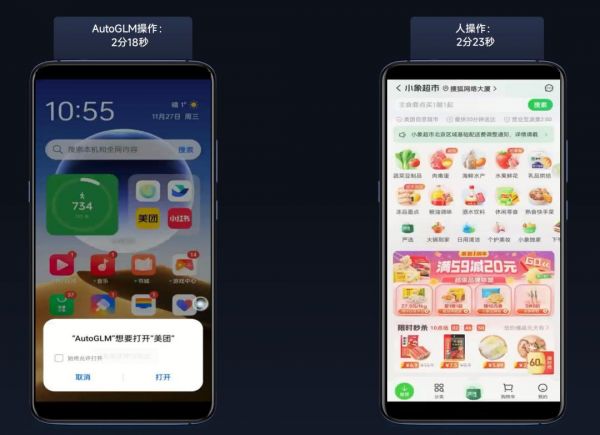 在另一个采购火锅食材的例子中,AutoGLM自主执行了54步操作,并且中间并未被打断。在多步、循环任务中,AutoGLM 的速度表现也超过人手动操作。