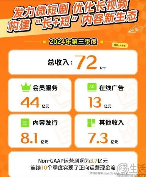 长视频平台的好日子似乎没过几天就结束了,在刚刚过去的两周里,国内主流四大长视频平台的业绩进入了集体下行态势。11月21日,爱奇艺方面发布2024年第三季度财报,显示其营收为72亿元、同比下降10%,归母净利润2.29亿元、同比下降51.8%。这份财报也意味着自进入2024年以来,爱奇艺的营收一直在走下坡路。