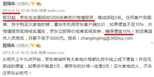 2012年8月14日上午10点,京东创始人刘强东连发两条微博,表示京东大家电将实行三年内零毛利,由此京东所有大家电将比国美、苏宁连锁店便宜10%以上。