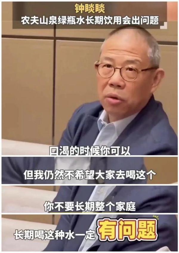 但是在11月19日,钟睒睒又表示,“不建议长期喝绿瓶水,它就是不值钱”,“口渴的时候,临时买一瓶、两瓶(绿瓶水)都没有问题。但整个家庭从早上到晚上长期喝一定是有问题的。大量饮水一定需要矿物质。”