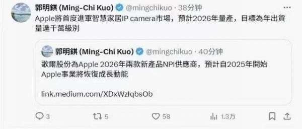 苹果分析师@郭明錤在其分析报告中也透露,苹果计划在2026年进军智能家居摄像头市场,并设定了年出货量达到千万台的目标。郭明錤还表示,歌尔股份已获得苹果新产品的独家组装供应商资格,这将为苹果智能家居摄像头的生产提供强有力的支持,确保产品质量和供应链的稳定性。