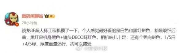 该博主透露,这款工程机提供白色和黑红拼色,都是玻纤后盖,黑红是机身黑色 + 镜头 DECO 环红色,“相机味儿十足”;还有个竖向拼色,1/5 白 + 4/5 绿,厚度重量还行。