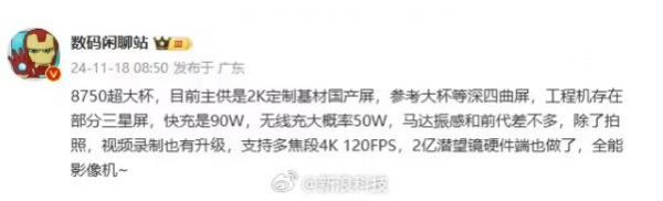 本月中旬,该博主还一款骁龙 8 至尊版“超大杯”新机的部分规格,预计同样为小米 15 Ultra。这款新机目前主供是2K 定制基材国产屏,参考大杯等深四曲屏,工程机存在部分三星屏,快充是 90W,无线充大概率 50W,马达振感和前代差不多,除了拍照,视频录制也有升级,支持多焦段 4K 120FPS,2 亿潜望镜硬件端也做了。