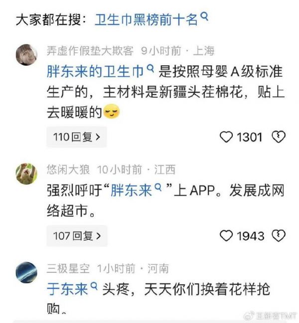 当消费者不知道该买哪家品牌,大大小小的卫生巾品牌集体沉默的时候,女生们的生理期焦虑更重了。在这种情况下,消费者开始选择信得过的渠道——胖东来。