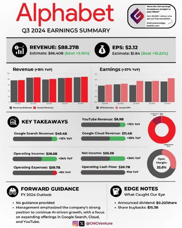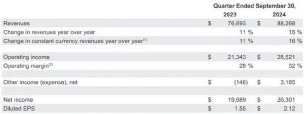 前不久,谷歌母公司Alphabet发布了截至9月30日的2024年第三季度财报。数据显示,今年第三季度,谷歌实现营业收入882.68亿美元,同比增长15%,高于分析师预期的864.4亿美元;非美国通用会计准则下(Non-GAAP)净利润为263.01亿美元,同比增长34%;摊薄后每股收益为2.12美元,同比增长37%,高于市场预期的1.83美元。