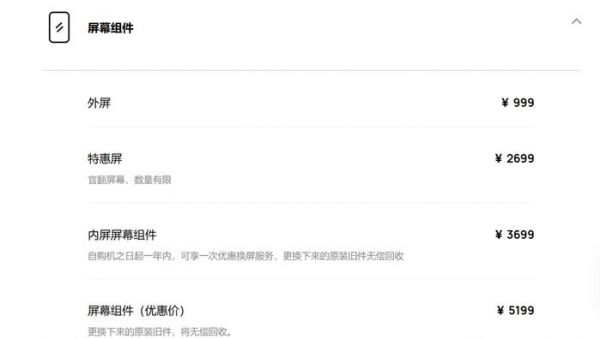 其中以华为Mate X6的12+256版本为例:外屏999元,内屏优惠价为2699元、标准价则是3699元,电池299元,后盖579元。主板优惠价3179元,标准价4499元,摄像头总和2994元。