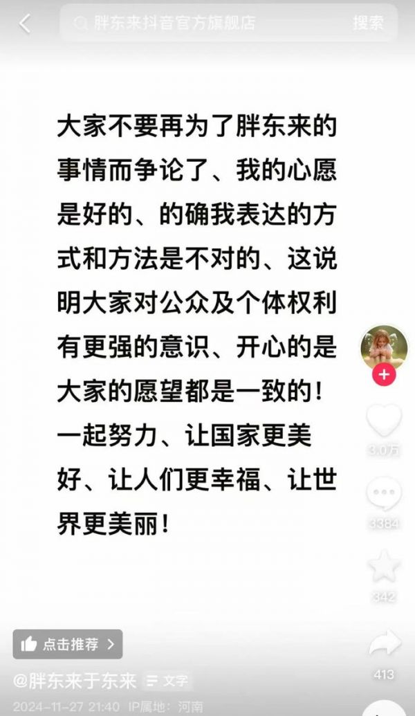 随后,相关话题引发热议,于东来在11月27日晚在社交媒体称,“大家不要再为了胖东来的事情而争论了,我的心愿是好的、的确我表达的方式和方法是不对的、这说明大家对公众及个体权利有更强的意识、开心的是大家的愿望都是一致的!”