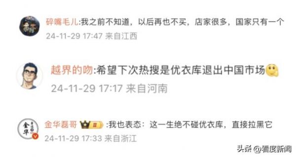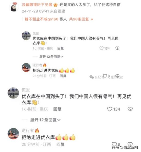 柳井正的表态引发了中国网友的集中声讨,表示“以后再也不买”、“希望下次热搜是优衣库退出中国市场”、“拉黑优衣库”等,网友纷纷指责优衣库在中国市场得利,转头却扬言不用新疆棉来背刺中国,一边说要在中国继续开店,另一边却又说不使用新疆棉。
