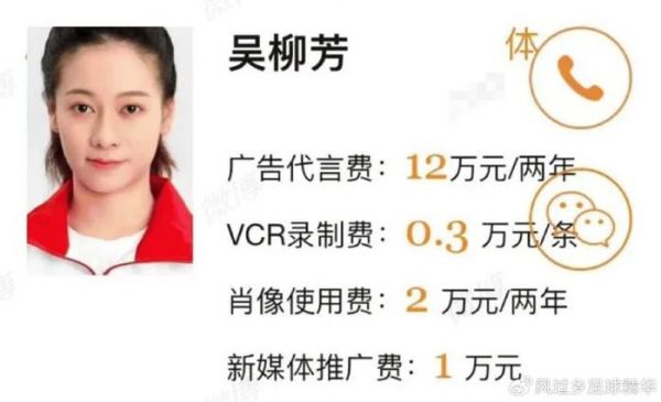有媒体曝光了吴柳芳此前的广告代言收费情况:广告代言费,12万/2年;VCR录制费,0.3万/条;肖像使用费,2万/2年;新媒体推广费,1万。
