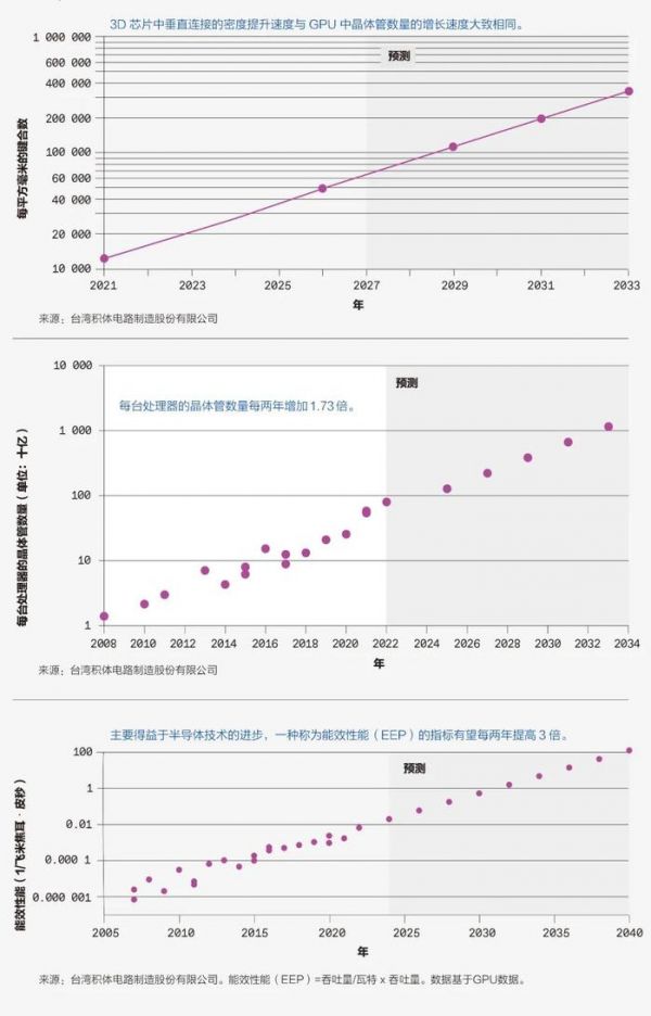 如果关注能效性能(EEP)这一指标的稳步提升,我们便可以从服务器GPU中看到这一趋势。能效性能是系统能源效率和速度的综合衡量指标。在过去15年里,半导体行业的能效性能每两年提高大约3倍。我们相信这一趋势将按照历史速度继续。它将受到来自多方面创新的推动,包括新材料、设备和集成技术、极紫外光刻、电路设计、系统架构设计以及所有这些技术元素的协同优化等。