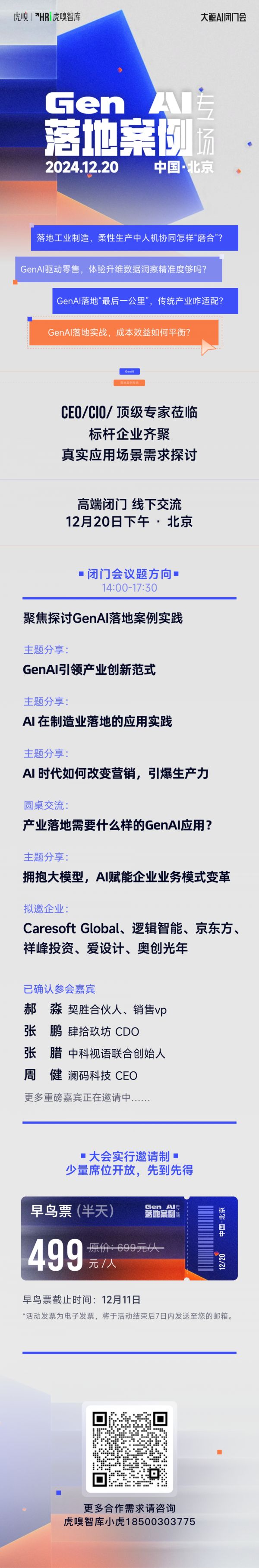 12月20日下午14点-17点,虎嗅智库将这次部分大鲸企业代表以及行业专家邀请到北京,我们期望通过专家对GenAI落地真问题的剖析、大鲸企业代表的应用案例实践分享,推动GenAI在行业的进一步落地。