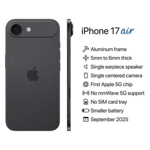 如今基本配置和预览造型已经出炉,根据情报,这次Air机型的预计机身厚度为5~6·毫米,将会配备A19芯片组和6.6英寸显示屏。