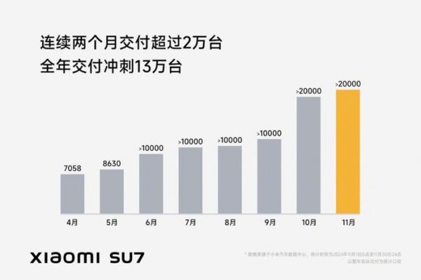 11 月小米汽车交付破两万,延续了上一个月的势头。趁热打铁,雷军发布微博,再度强调 Q3 财报中的计划,小米汽车“全年目标已提高到13万辆”。