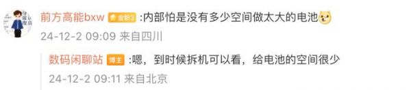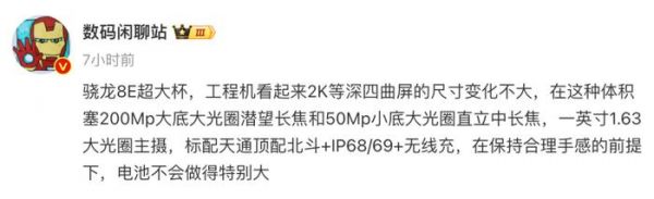 上图为网传的小米15 Ultra工程机谍照据爆料达人数码闲聊站暗示:小米15 Ultra工程机将采用2K等深四曲屏,尺寸变化不大,后置塞了1英寸F1.63大光圈主摄、50MP小底大光圈直立中长焦、200MP大底大光圈潜望长焦(后置四摄另一颗超广角预计同样是50MP),标配天通顶配北斗卫星通信、IP68&IP69、无线充电,在保持合理手感的前提下,电池不会做得特别大,120W有线快充绝无可能,似乎90W的概率比较大。