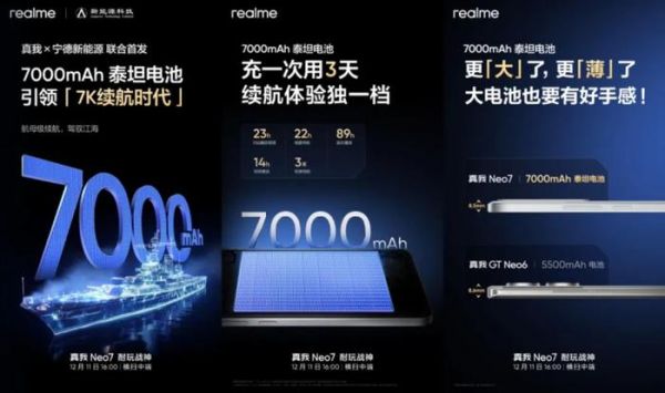 如上图所见,和此前爆料一致,真我Neo7将配备7000mAh大电池,官方称联合宁德新能源联合首发7000mAh泰坦电池,800Wh/L电池能量密度,机身厚度8.5mm,相比上一代电量提升1500mAh,比上代薄了0.1mm。