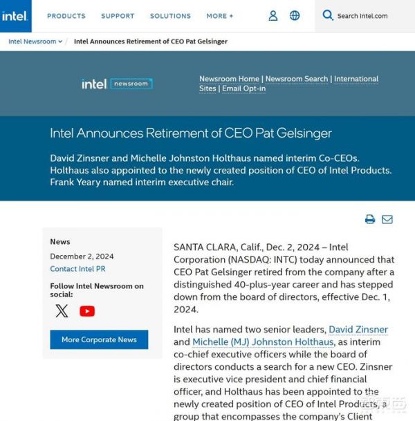 关于接替人选,英特尔任命了大卫·津斯纳(David Zinsner)和米歇尔(MJ)·约翰斯顿·霍尔索斯(Michelle Johnston Holthaus)为临时联席首席执行官,同时董事会正在物色一位新的首席执行官。