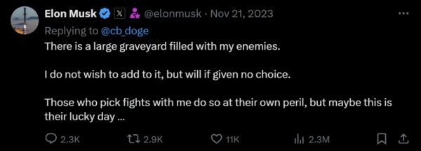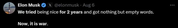 随后,马斯克起诉了一群广告商,指控他们的广告抵制行为是非法的,并在X上表示:“我们尝试了两年和平,现在是战争。”
