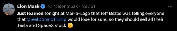 “今晚在海湖庄园得知,杰夫·贝佐斯告诉所有人,特朗普肯定会输,所以他们应该卖掉所有特斯拉和SpaceX的股票。”