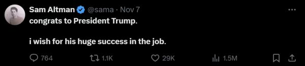 奥特曼也在小心翼翼地避免与特朗普产生冲突。在特朗普获胜的早晨,奥特曼在X上发文祝贺,并且打破了他一贯的小写风格,以示对特朗普的尊重,奥特曼写道: