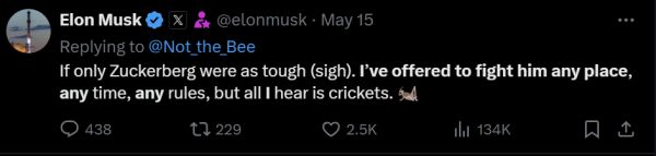 去年,马斯克表示要与扎克伯格进行拳击比赛,这是为了回应扎克伯格推出的X竞品——Threads。