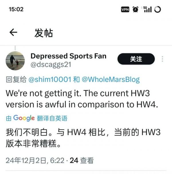 另外FSD V13.2的优秀表现目前是基于HW4硬件的,还有用户在X平台上称,搭载HW3硬件的自动驾驶水平依旧很糟糕,达不到资深用户所呈现的效果。