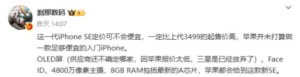 博主@刹那数码 近日的一份爆料中提到,iPhone SE 4定价不会便宜,一定比上代3499元的起售价高,苹果并未打算做一款足够便宜的入门iPhone。