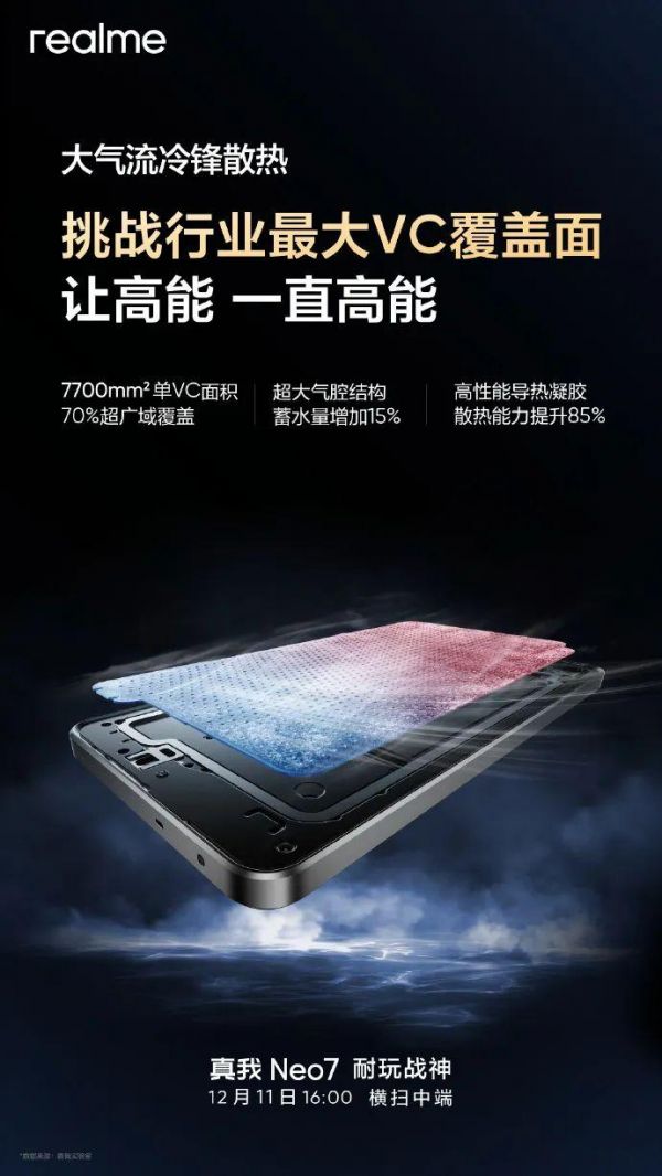 散热方面,真我 Neo7将搭载“大气流冷锋散热”,号称“挑战行业最大VC覆盖面”。