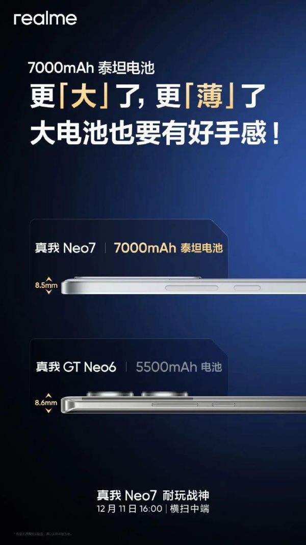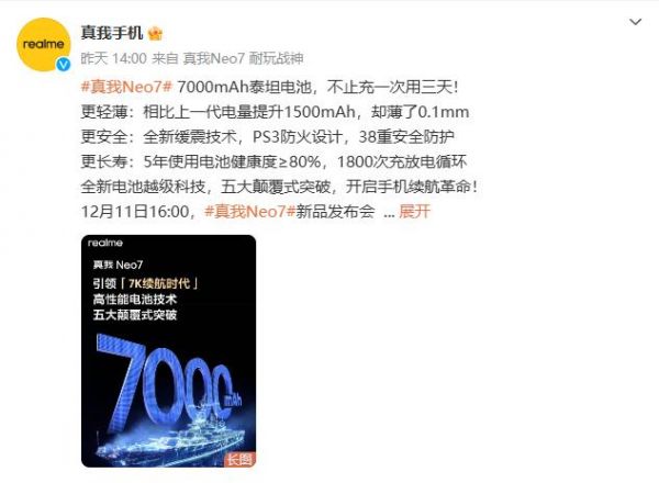 官方的预热中提到,真我Neo7将首发7000mAh泰坦电池,引领手机行业进入“7K续航时代”。