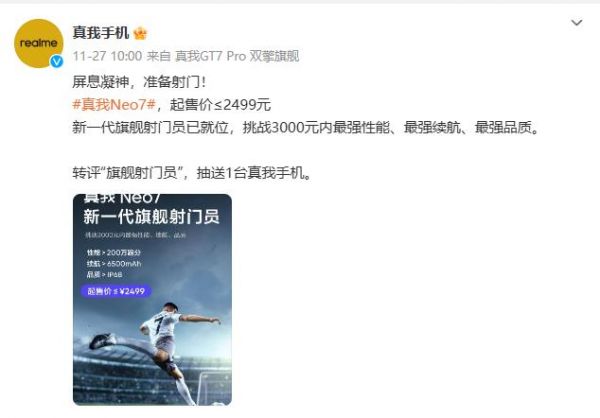 起售价不足2499元,真我Neo7定档12月11日发布