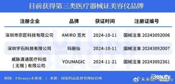 11月22日,国家药监局发布《关于批准注册255个医疗器械产品的公告(2024年10月)(2024年第141号)》,其中有两家美容仪企业正式获批注册,即深圳市宗匠科技有限公司旗下的AMIRO觅光和深圳宇石科技有限公司旗下的玛丽仙,成为了首批获得第三类医疗器械证的美容仪品牌。11月25日,YOUMAGIC官方公众号也发文表示,YOUMAGIC高能单极射频皮肤治疗仪获得了三类医疗器械注册证。