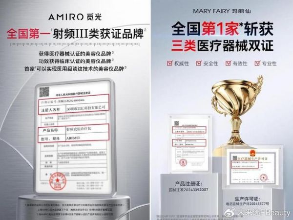 可以看到,AMIRO觅光、玛丽仙两大品牌旗舰店都亮出“全国第一射频III类获证品牌”“全国第1家斩获三类医疗器械双证”的海报。