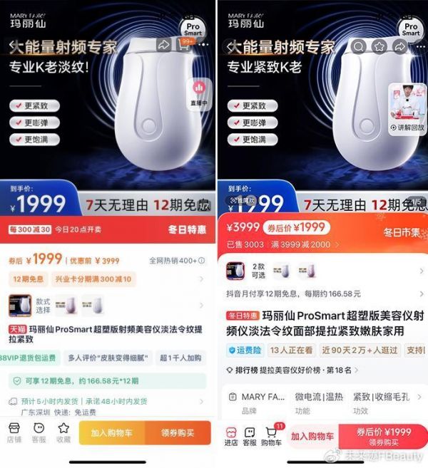目前AMIRO觅光还未上架持证产品,品牌官方表示正在“紧锣密鼓”地筹备中。玛丽仙已上架持证产品“玛丽仙PRO SMART超塑版美容仪”,这也是目前全网唯一一个持证射频美容仪。