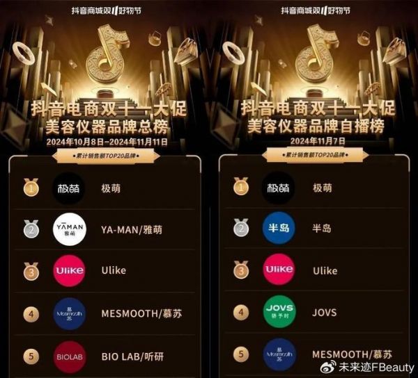 去年,AMIRO觅光和FLOSSOM花至凭借蓬勃的增长态势,超过一众美妆品牌,闯入天猫双11美妆榜TOP20。但是在今年,天猫、抖音等多个平台的美妆榜单都难见美容仪品牌的身影。《FBeauty未来迹》数据显示,2024年1-10月线上面部美容仪市场,更是出现暴跌,淘天和抖音的销售额同比下跌分别达到40.96%和49.88%。