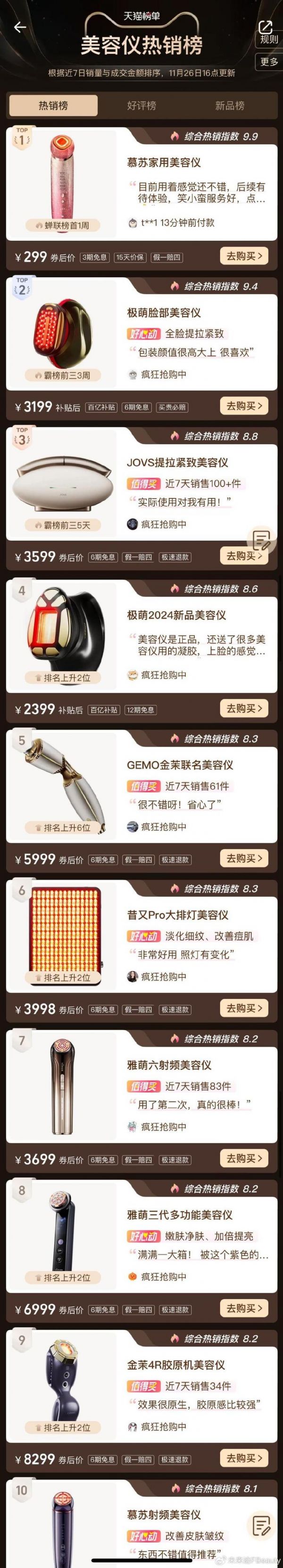根据11月26日更新的天猫“美容仪热销榜”,慕苏家用美容仪位居榜单第一,这也是目前TOP10榜单中售价最为便宜的产品,单价为299元,主要宣称提拉、淡纹、清洁的功效。