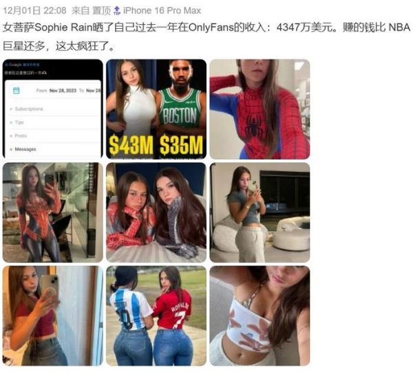 比如这个,最近在国外都上热搜了,一年收入4347万美元,堪称擦边女神。