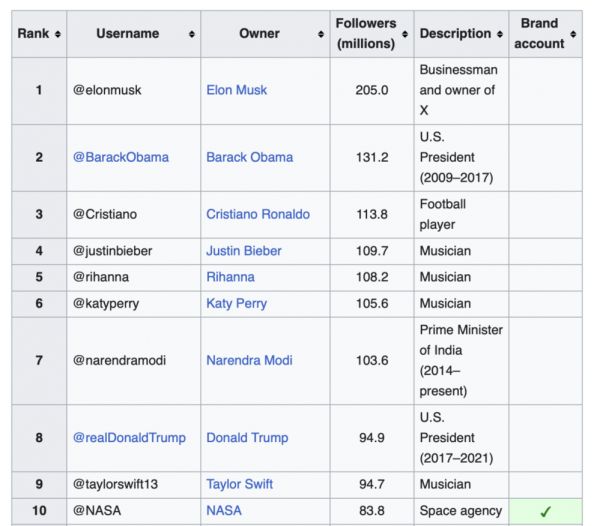 X上关注者排名,特朗普和马斯克是前十名里活跃度最高的用户|图源:Wikipedia