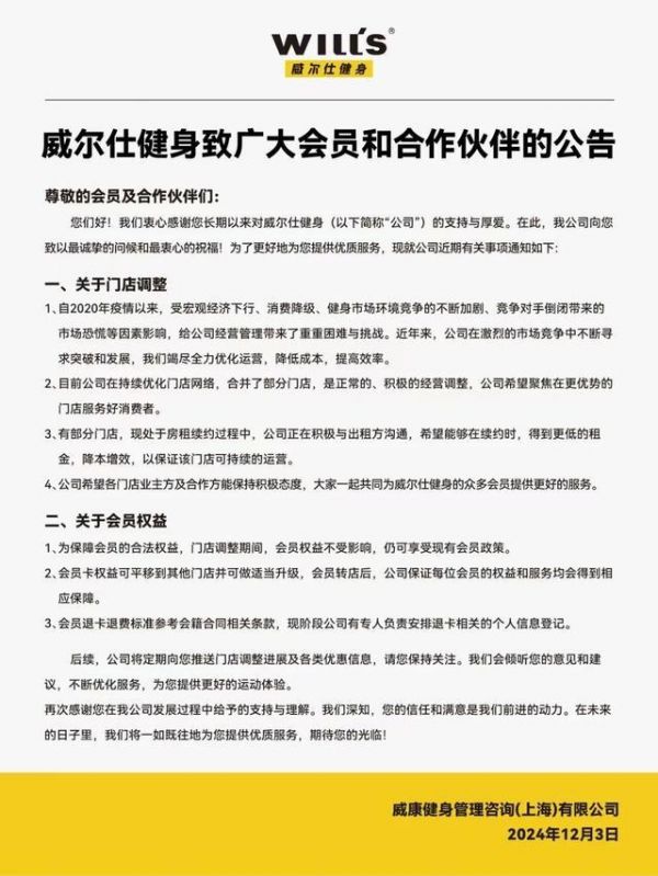 威尔仕在公告中表示,自2020年疫情以来,受宏观经济下行、消费降级、健身市场环境竞争的不断加剧、竞争对手倒闭带来的市场恐慌等因素影响,给公司经营管理带来了重重困难与挑战。近年来,公司在激烈的市场竞争中不断寻求突破和发展,竭尽全力优化运营,降低成本,提高效率。