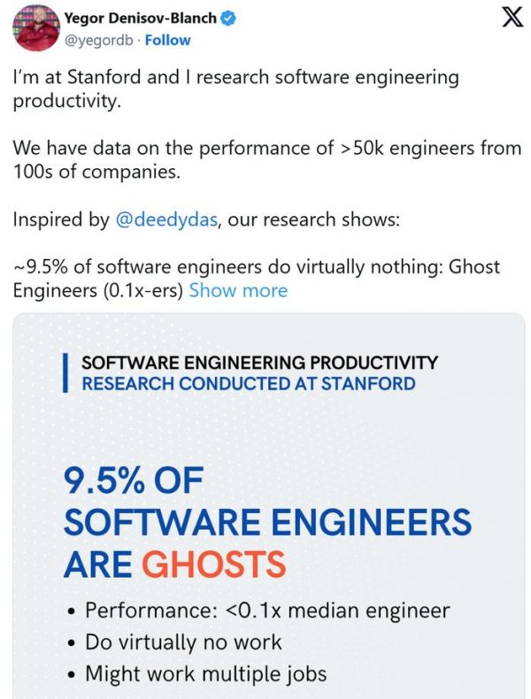 在科技行业工作过一段时间的人,大多都听说过关于幽灵工程师职位的传言,但斯坦福研究员 Yegor Denisov-Blanch 最近分享的研究成果,将这些传言从都市传说变为了有数据支撑的现实。