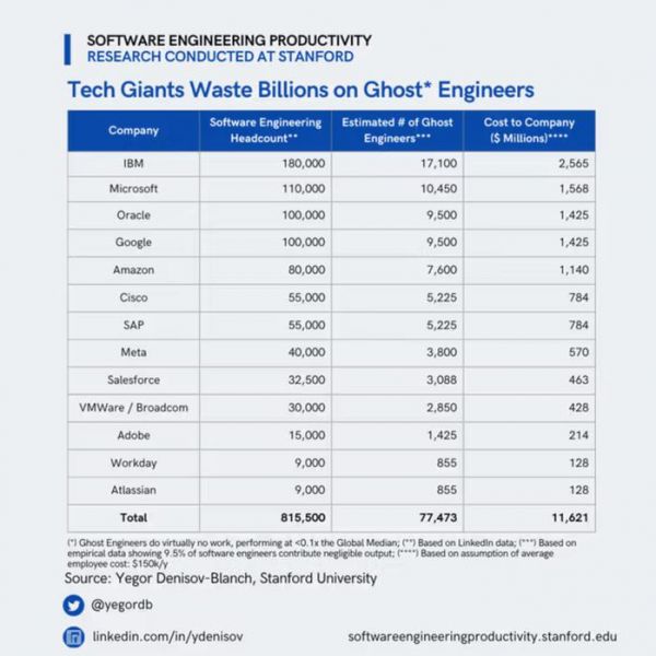 斯坦福大学的研究人员估计,像思科、英特尔和 IBM 这样的公司,如果裁掉“幽灵”员工,每年可以节省数十亿美元,并且不会对公司的业绩产生任何负面影响。同时,这还将为这些公司的总市值增加 4650 亿美元。从全球范围来看,即使采用保守估计,也有超过 900 亿美元实际上被浪费在了这群几乎没有任何贡献的工程师身上。