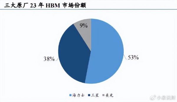 因此,全球能量产HBM芯片的公司,只有SK海力士、三星、美光这三家。海力士的市场份额最高,2023年已经过半达到53%,三星跟美光分别为38%、9%。