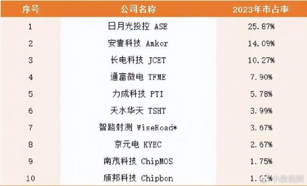 据统计,2023年长电科技在封测市场以10.27%的市占率排名全球第三,仅次于日月光(25.87%)、安靠(14.09%);排名国内第一,高于通富微电、南茂科技、华天科技。