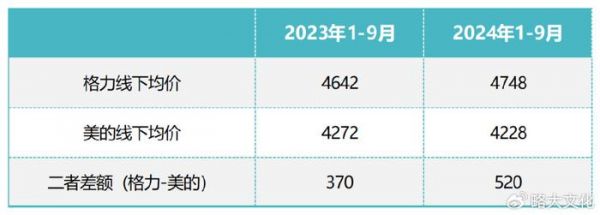 略大参考基于奥维云网公开数据计算发现,2024年前9个月,格力和美的在空调方面的线下销售额的均价差额数为520元,较2023年370元的差额有着明显上升。